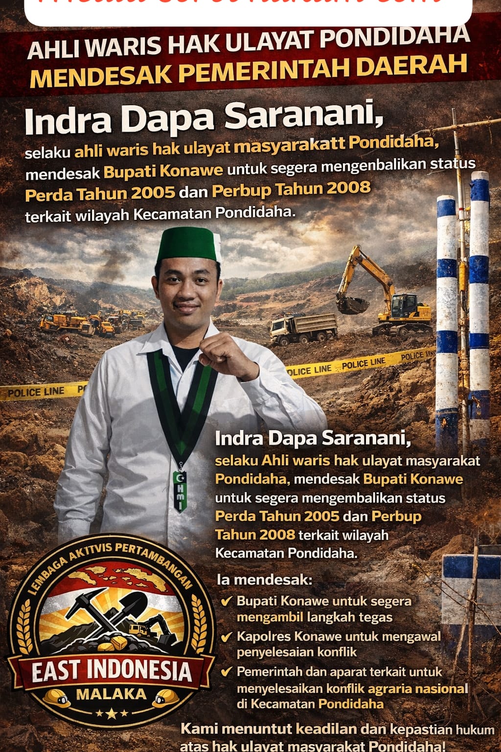 Sorot Hukum com — Konawe — Lembaga Aktivis Pertambangan East Indonesia Malaka secara tegas mendesak Bupati Konawe dan Kapolres Konawe untuk segera mengambil langkah konkret dalam menyelesaikan persoalan tapal batas antara Kecamatan Pondidaha dan Kecamatan Amongedo.